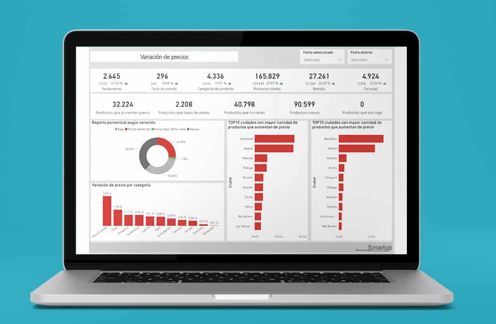 Desde el punto de vista de la variación de precios, hemos dotado al equipo de Mahou de una herramienta de análisis de la variación de precios en el mercado nacional, identificando las familias de productos que mayor aumento de precios han experimentado, las que menos y dentro de ellas, los productos específicos que porcentualmente o en su valor neto experimentan mayores oscilaciones en el tiempo, además de una indicación geográfica precisa de dónde se producen esas variaciones.
